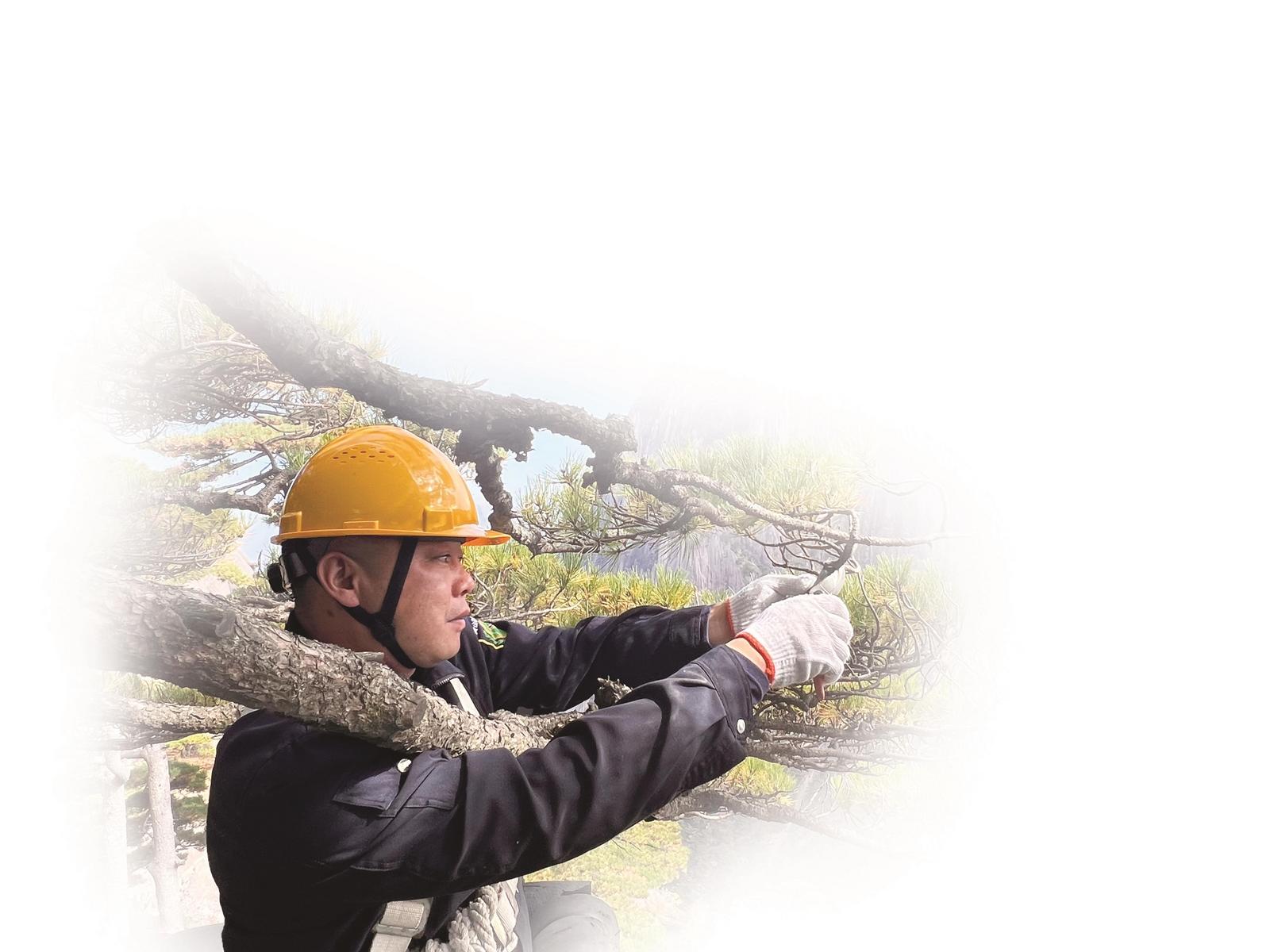 拉纖是防止迎客松因風力過大,枝條大幅擺動甚至折斷的最好方法。狂風暴雨中,胡曉春在迎客松倒一枝需要牽拉的部位用棕毛、麻袋包裹,然后緊緊捆扎,防止牽拉操作時損傷樹皮和枝條。一陣疾風吹來,胡曉春身體猛地搖擺,腳下打滑,一個趔趄,險些摔倒。迎客松倒一枝距離地面兩三層樓高,一旦跌下去,后果不堪設想。胡曉春顧不得害怕,將寬型尼龍吊裝帶綁到倒一枝上,等到狂風減弱,樹枝停擺,急忙將纖繩的另一頭纏繞到護欄上。
