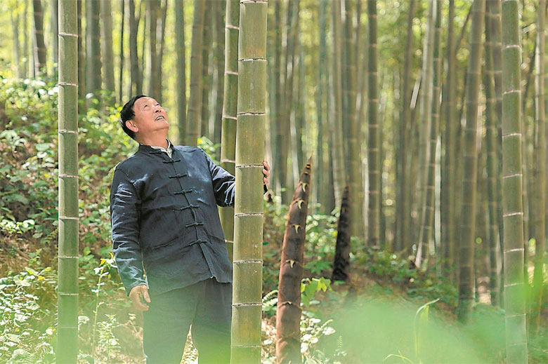 4月14日,王明德在廣德市東亭鄉的竹林里精挑細選用來制扇的竹子。