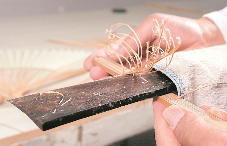 “竹子是有靈性的,扇骨打磨時得順著它的紋理走,要做到‘白如玉、光如鏡’。”4月10日,在明德竹木工藝制品有限公司的手工制扇車間里,王明德與手工匠人王明福交流制扇心得。出生于制扇世家的他,16歲便正式跟隨父親學習制扇技藝。上世紀90年代,面對傳統折扇易變形的行業痛點,他帶領團隊開展技術攻關:通過改良蒸煮工藝參數,歷經數百次試驗,終于將扇骨變形率降至0.5%以下,創造出“薄如蟬翼、堅若磐石”的竹骨工藝,扇骨最薄處僅45絲,相當于兩個塑料袋的厚度。在占地千余平方米的傳承基地內,完整保留著“王氏制扇”古法技藝的精髓。從廣德6年生毛竹的選材開始,要歷經開坯、蒸煮、刮青等40道工序,再經構圖、描金、固色等30道藝術加工。匠人們手持特制刀具,在竹片上雕刻出細若發絲的纏枝紋樣,刀鋒游走間盡顯東方美學。