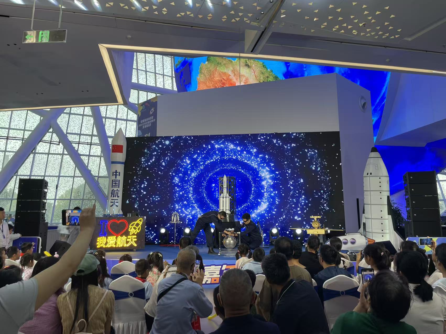 上午10點,省科技館一樓公共空間主舞臺前坐滿了小朋友,航天探索秀由穿著航天服的工作人員上臺與小朋友互動拉開帷幕。活動以“火箭如何克服真空環(huán)境挑戰(zhàn)?”“空間站對接藏著哪些科技密碼?”等問題開篇,瞬間勾起小朋友們的好奇心。航天員出征儀式、火箭點火騰空等場景的生動演示,現(xiàn)場觀眾仿佛置身航天發(fā)射現(xiàn)場,直觀了解到航天任務(wù)中的關(guān)鍵技術(shù)。