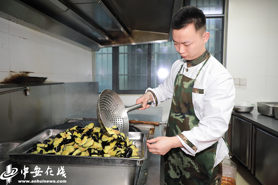 此時,炊事員皺曉東正在操作間里為大家烹制菜肴。操作臺上擺滿了雞蛋、肉末、粉絲、韭菜、茄子等各色新鮮食材,就在今晚,它們化作廚房交響曲的音符,在戰士們手中煥發著活力。