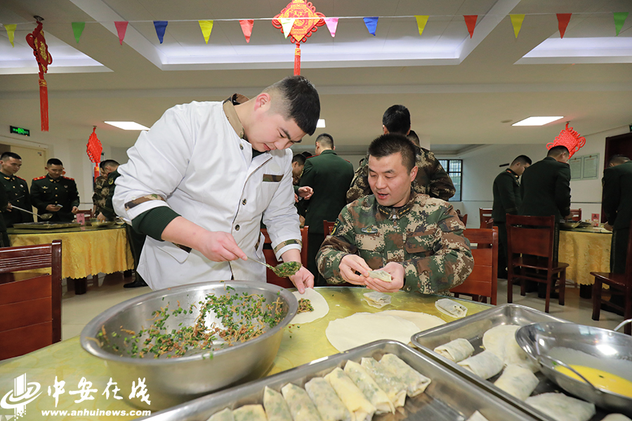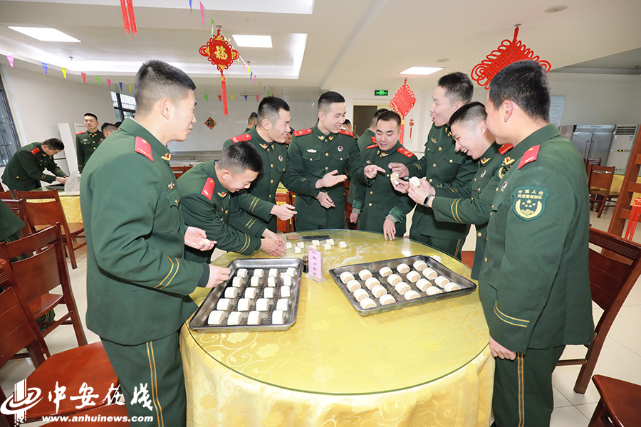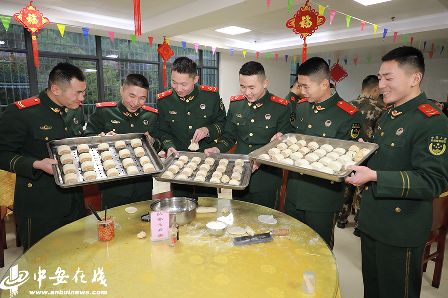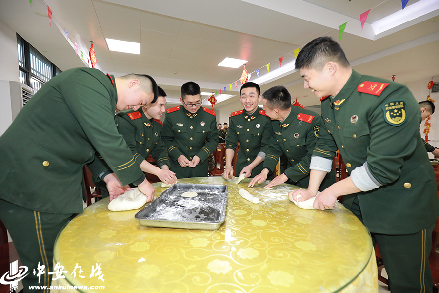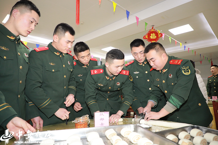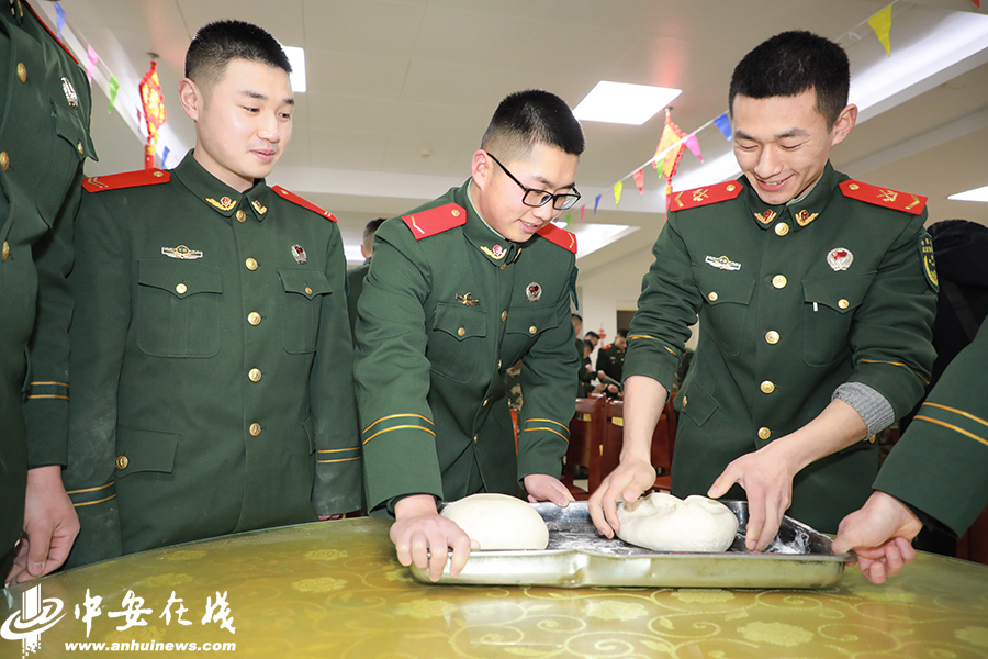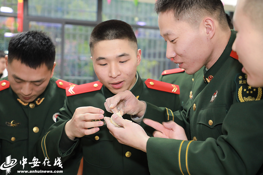 2月18日,在武警安徽省總隊合肥支隊十九中隊慶元宵活動現場,官兵們自己揉面、和餡、做饅頭,食堂里充滿了歡聲笑語。
