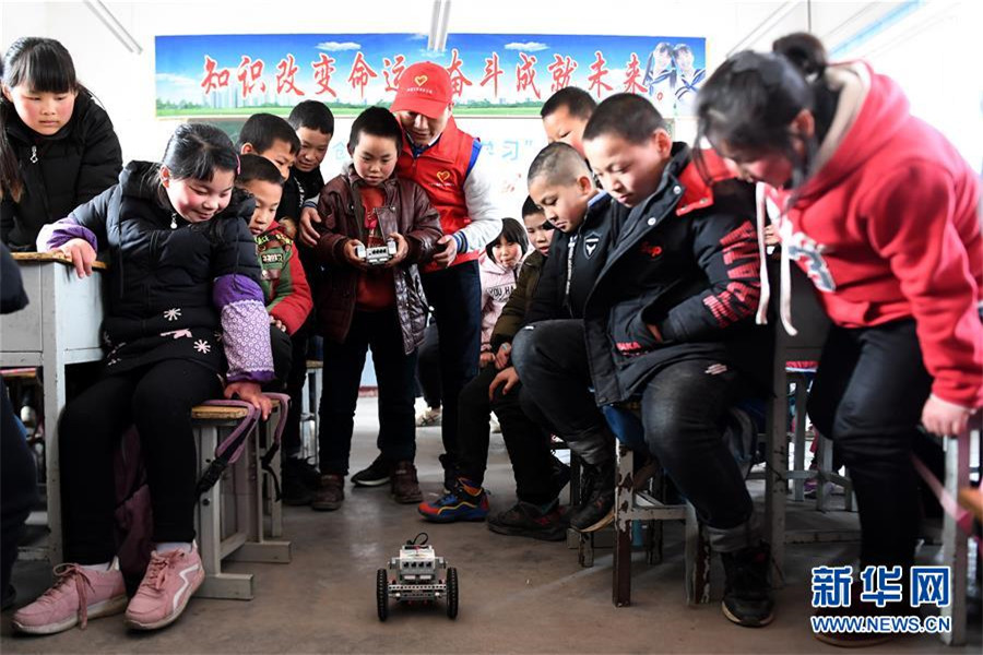 3月4日,陜西省富平縣老廟鎮峪嶺小學學生在中建三局西北公司志愿者的指導下操作機器人。