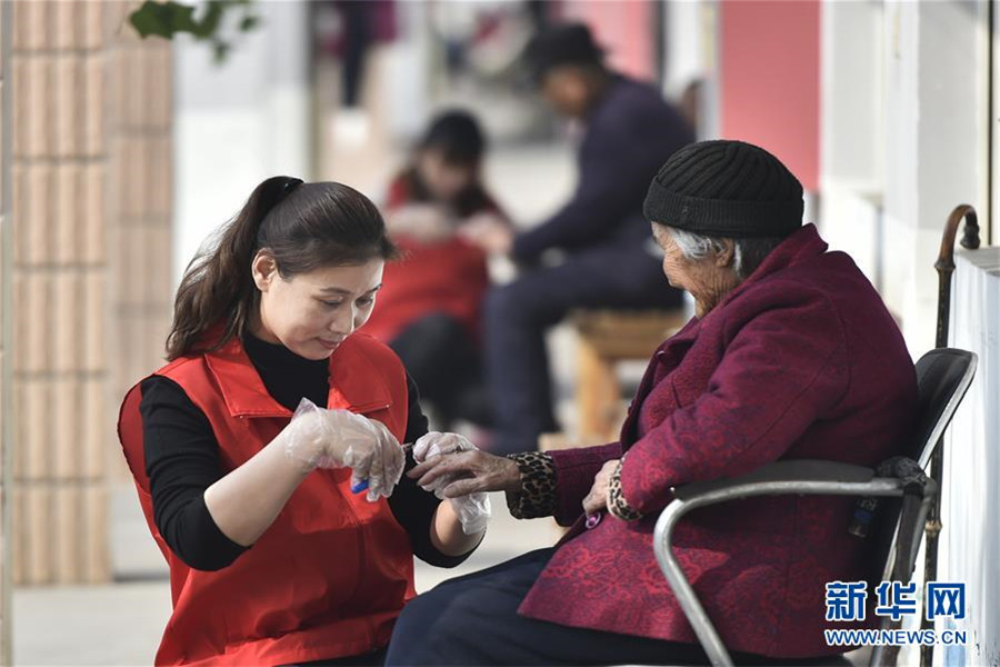 3月4日,在山東省鄒平市明集鎮一家敬老院,志愿者為老人修甲。