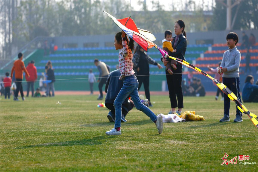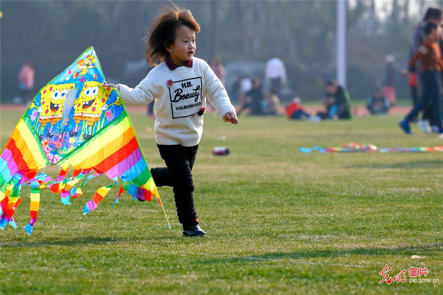 2019年3月10日,安徽廬江縣少年兒童在全民健身運動中心放風箏,盡情享受快樂春光。(王閩攝/光明圖片)