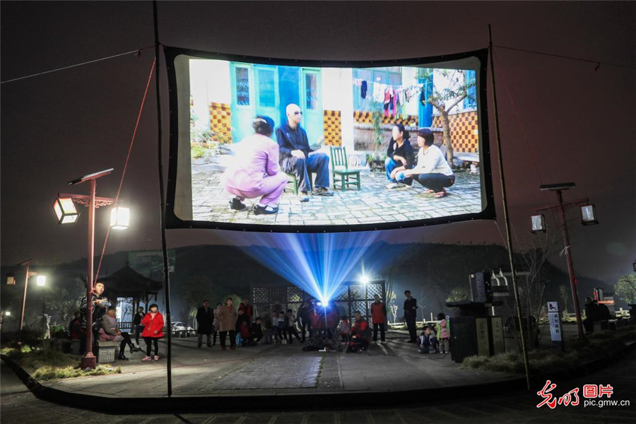 在四川省華鎣市有一支由"流動(dòng)電影院"和"流動(dòng)圖書館"聯(lián)合組成的法治宣傳隊(duì),他們以山區(qū)群眾喜聞樂見的形式,把歡樂和法治知識(shí)送到千家萬(wàn)戶。圖為,2019年3月12日,宣傳隊(duì)在陽(yáng)和鎮(zhèn)偏巖子新村放映法治宣傳片"農(nóng)村防范詐騙常識(shí)"。(邱海鷹攝/光明圖片)