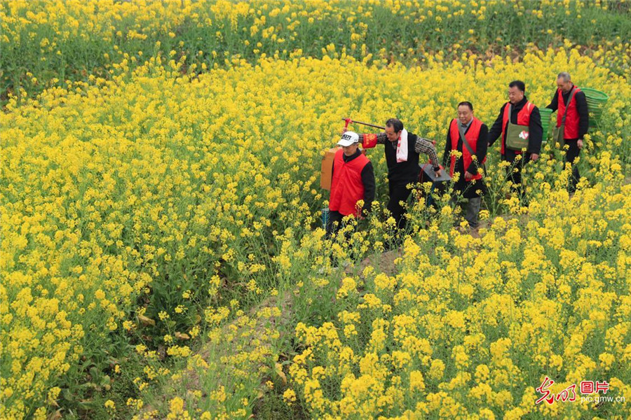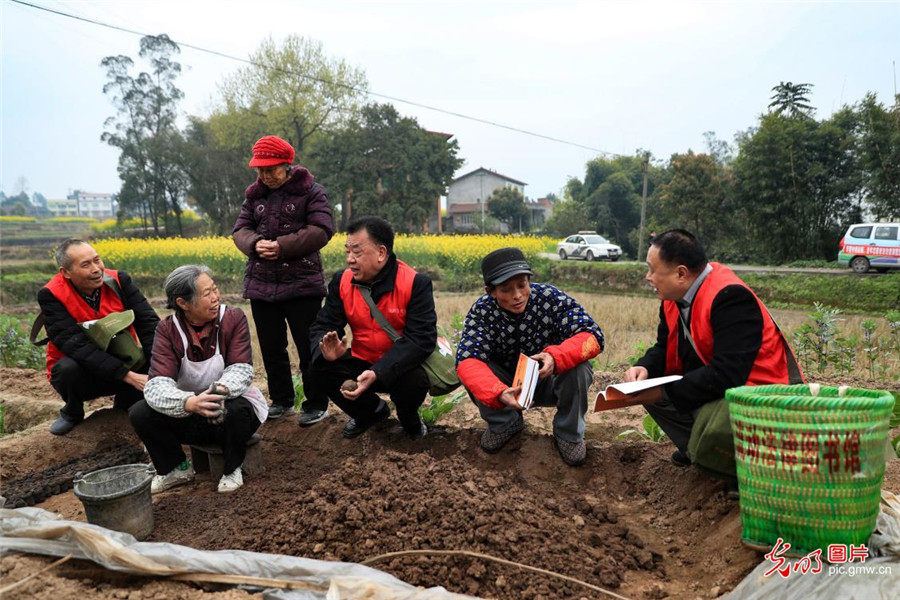 在四川省華鎣市有一支由"流動(dòng)電影院"和"流動(dòng)圖書館"聯(lián)合組成的法治宣傳隊(duì),他們以山區(qū)群眾喜聞樂見的形式,把歡樂和法治知識(shí)送到千家萬(wàn)戶。圖為,2019年3月12日,宣傳隊(duì)在東方村的田間地頭,給勞作的群眾宣講法治知識(shí)。(邱海鷹攝/光明圖片)