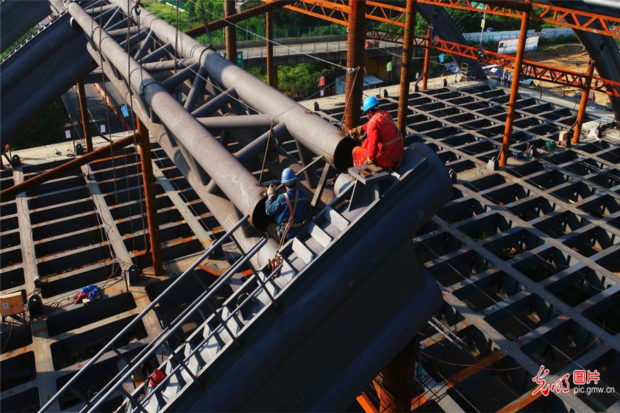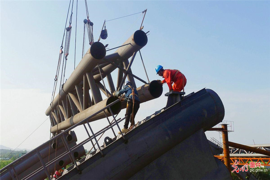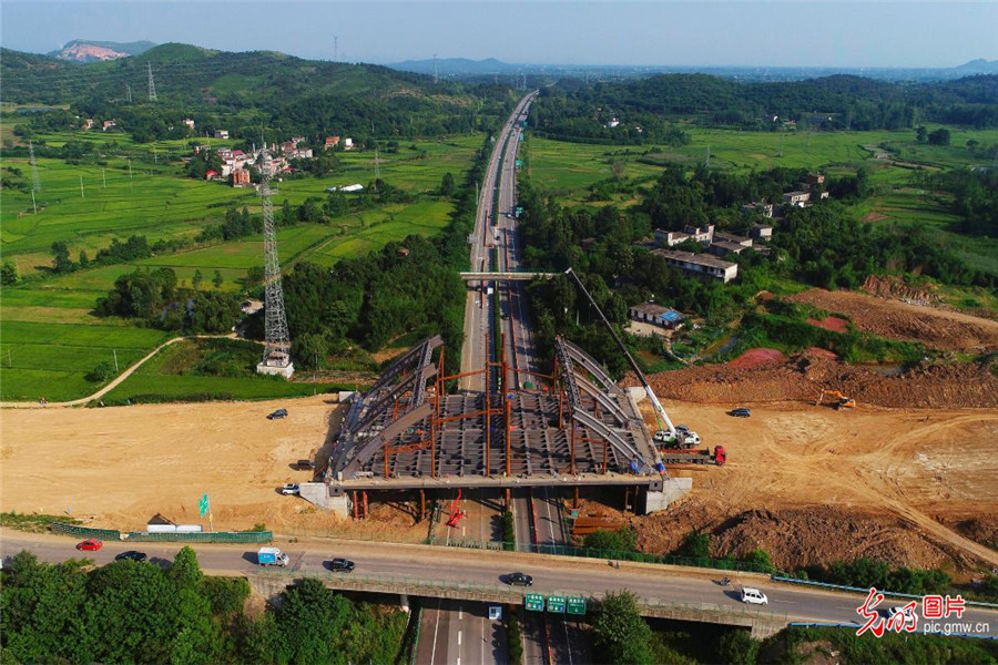 2019年7月2日,施工人員正在安徽省合肥市廬江縣境內的巢廬公路(廬城至桐城段)上跨G3京臺高速橋進行鋼結構安裝作業。巢廬公路改建工程,起于G3京臺高速廬江南出口與廬江外環南路交叉口,終至廬江縣與桐城市交界處,全長20.3公里,是合肥南部副中心一條一級公路。(王閩攝/光明圖片)