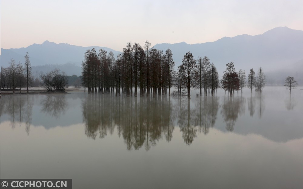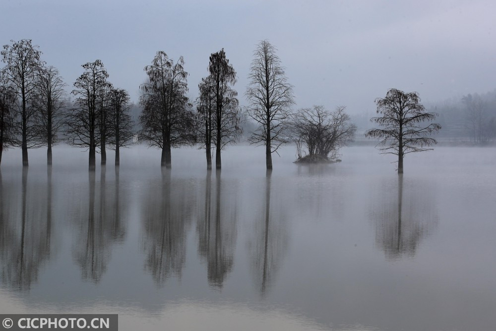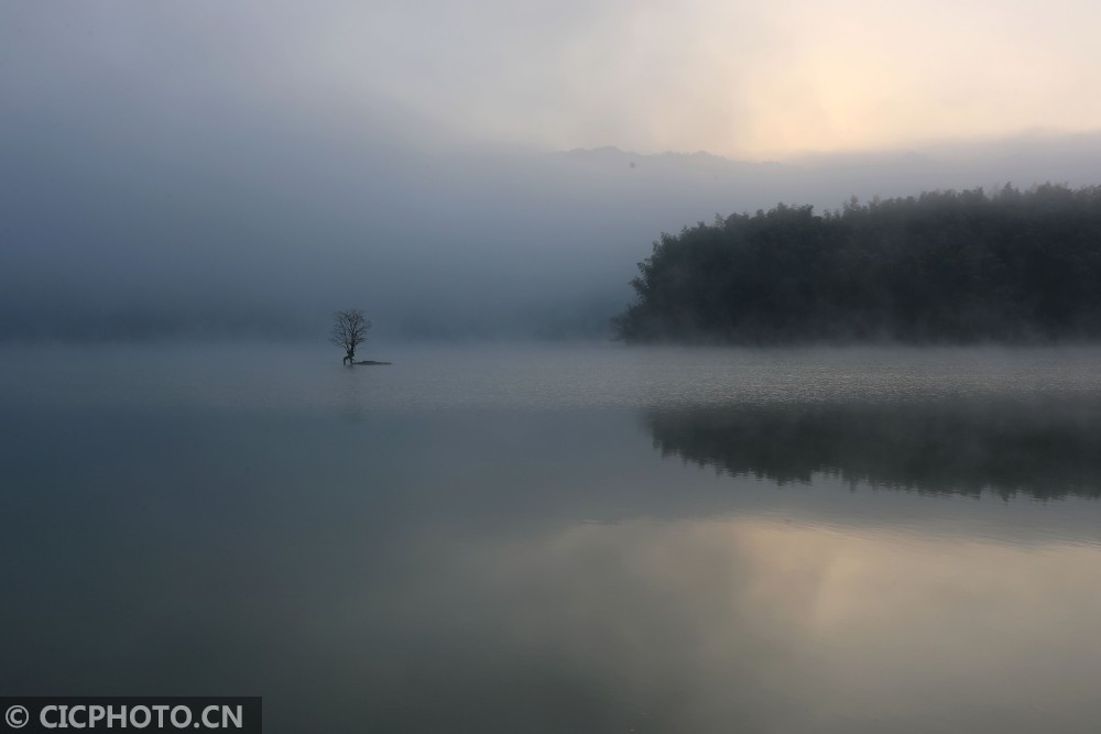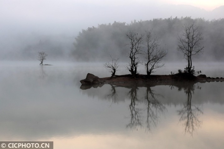 當日,在安徽黃山,一層蒸騰流動的平流霧籠罩著奇墅湖,宛若一幅水墨畫卷。