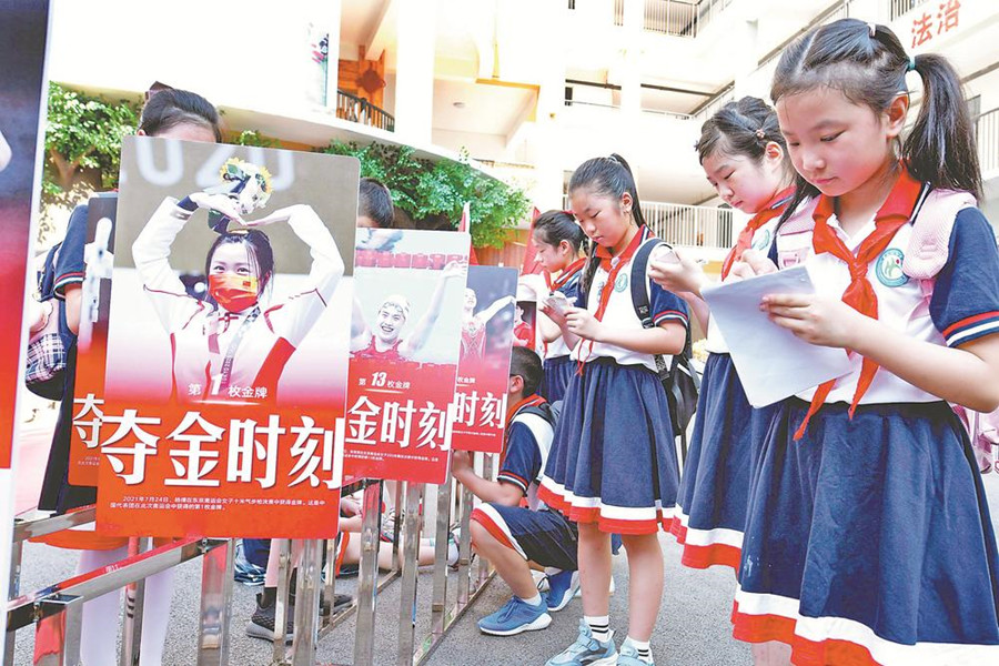 8月31日,安慶市迎江區(qū)華中路第一小學(xué)開(kāi)展“學(xué)習(xí)奧林匹克精神 爭(zhēng)做新時(shí)代好少年”愛(ài)國(guó)主義主題教育活動(dòng),學(xué)生們通過(guò)宣傳展板,學(xué)習(xí)奧運(yùn)冠軍的拼搏精神。 通訊員 黃有安 余燕 攝
