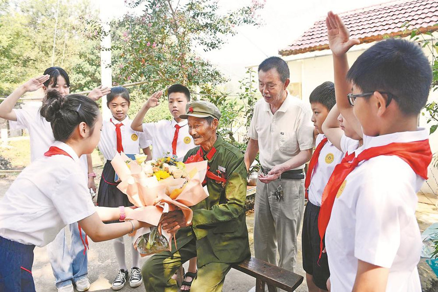 8月31日,含山縣環(huán)峰小學(xué)學(xué)生和新時(shí)代文明實(shí)踐中心等單位的志愿者們走進(jìn)陶廠鎮(zhèn)卜李村,聆聽(tīng)97歲的抗戰(zhàn)老兵沈永道講述革命故事,接受愛(ài)國(guó)主義教育。 通訊員 歐宗濤 攝