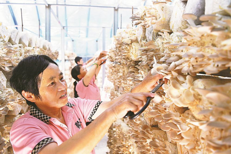 6月21日,六安市金寨縣關(guān)廟鄉(xiāng)大埠口村秀珍菇種植基地的工人在加緊采摘秀珍菇,分揀后銷往市場。