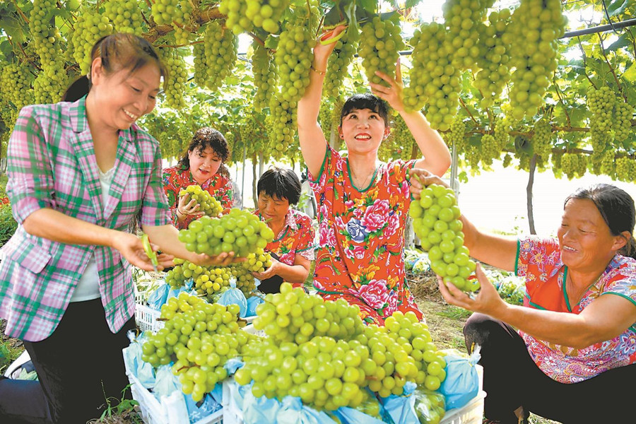 9月10日,在亳州市譙城區趙橋鄉雙樓村“徽姑娘”家庭農場,果農在采收葡萄以供應市場。近年來,亳州市大力發展生態休閑農業,幫助農民在家門口實現就業增收。