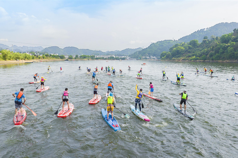 5月26日,2024長三角綠水青山運動會越江向湖·槳板賽在歙縣開賽,近700名槳板賽選手和體育運動愛好者,在新安江面上,奮力揮槳,逐浪前行。此次比賽為2024長三角綠水青山運動會的第三站賽事,由滬蘇浙皖一市三省體育局與黃山市人民政府主辦。