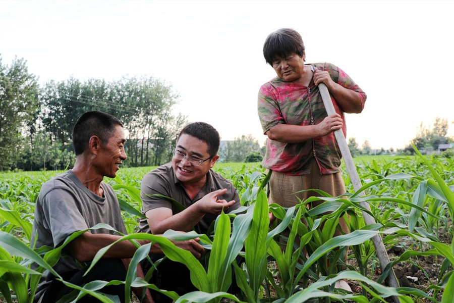 日前,科技特派員(中)在阜陽市潁東區向陽村為農民進行玉米田管技術指導。連日來,潁東區組織100多名科技特派員深入田間地頭,面對面向農民傳授在地作物病蟲害防治等田管知識。通訊員 宿 飛 張 煜 攝