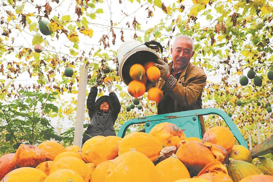 10月19日,阜陽市潁東區(qū)口孜鎮(zhèn)焦莊村瓜蔞種植基地,村民在采收成熟的瓜蔞。近年來,該區(qū)大力發(fā)展瓜蔞種植產(chǎn)業(yè),延伸拓展產(chǎn)業(yè)鏈,促進(jìn)農(nóng)業(yè)增效、農(nóng)民增收。