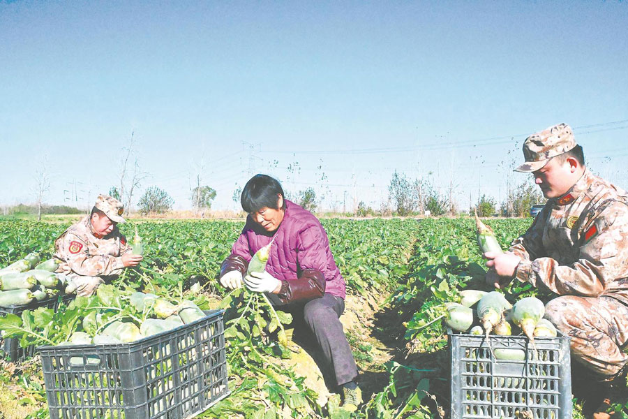 近日,長豐青蘿卜陸續上市,該縣人武部聯合左店鎮人武部組織民兵幫助種植戶采收蘿卜。通訊員 杜剛 攝