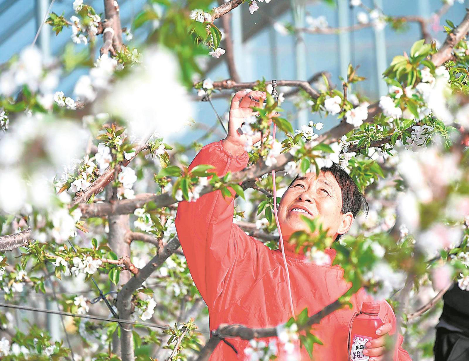 2月7日,宿州市碭山縣李莊鎮(zhèn)鎮(zhèn)東村果農(nóng)在車?yán)遄哟笈飪?nèi)為花朵進(jìn)行人工授粉。通訊員 崔猛 攝