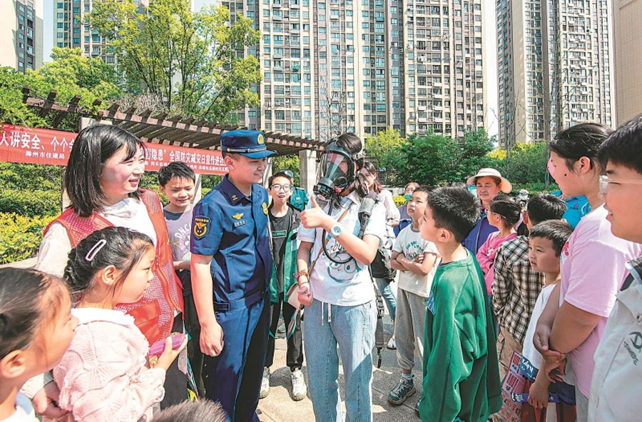 5月11日,在滁州市南譙區東坡社區和順東方花園居民小區,南譙區消防救援局指戰員在指導居民和孩子們災害發生時如何正確使用正壓式空氣呼吸器。