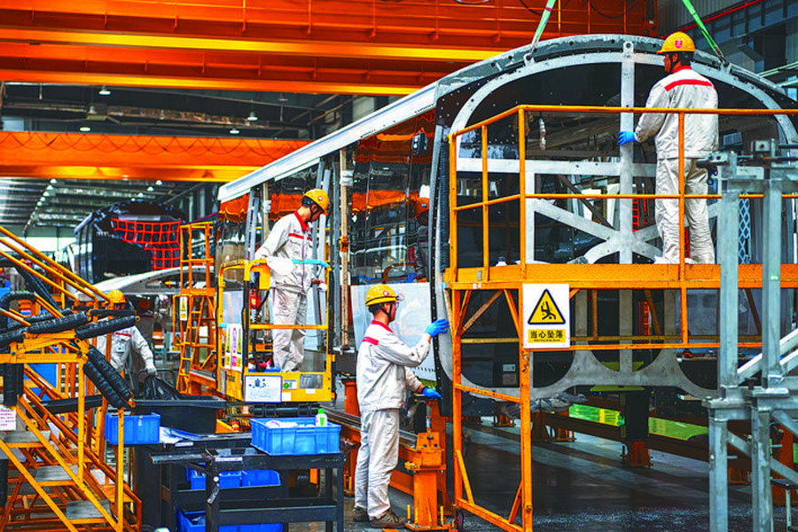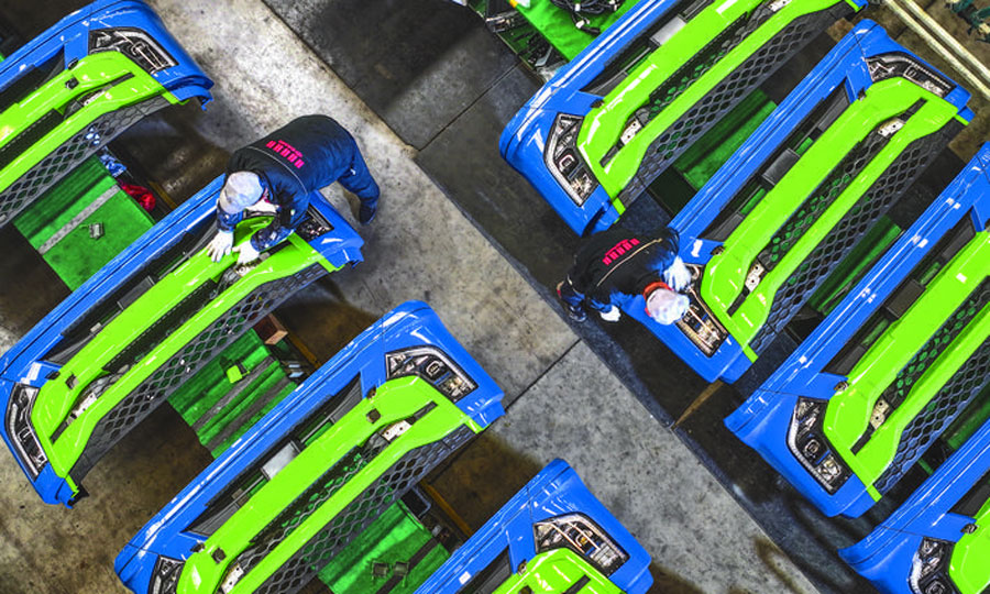 馬鞍山經(jīng)開區(qū)漢馬科技集團新能源重卡汽車裝配線上,工人在裝配新能源汽車。王文生 攝