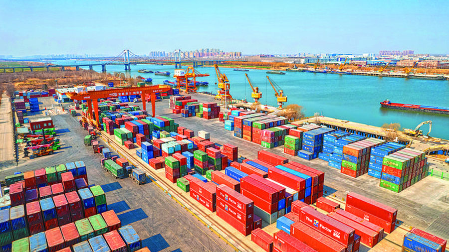 淮河蚌埠港國際集裝箱碼頭一派繁忙的場景,龍門架下大型卡車穿梭不停,貨車排隊卸貨,場橋下集裝箱拖車穿梭不停,波光粼粼的淮河航道上,一艘艘貨輪載滿集裝箱駛向遠方。張培 攝