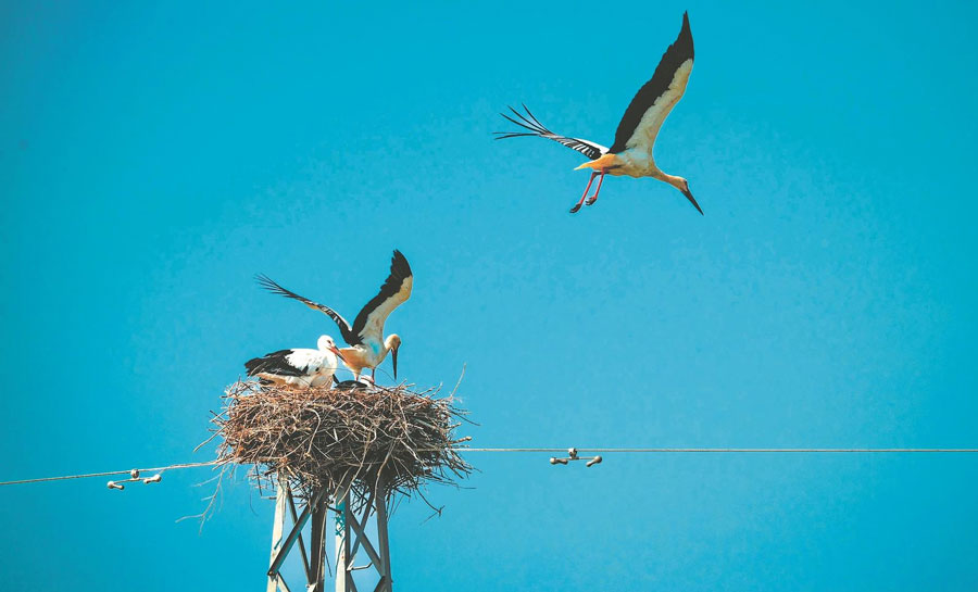 東方白鸛是國家一級保護動物,也是世界瀕危物種。今年2月,一對東方白鸛在輸電鐵塔上的鳥巢里產卵,當地供電部門與保護區迅速行動,安裝監控設備、安排專人巡護,并聯合養殖戶投放魚蝦,保障其食物供應,共同維護美好生態。
