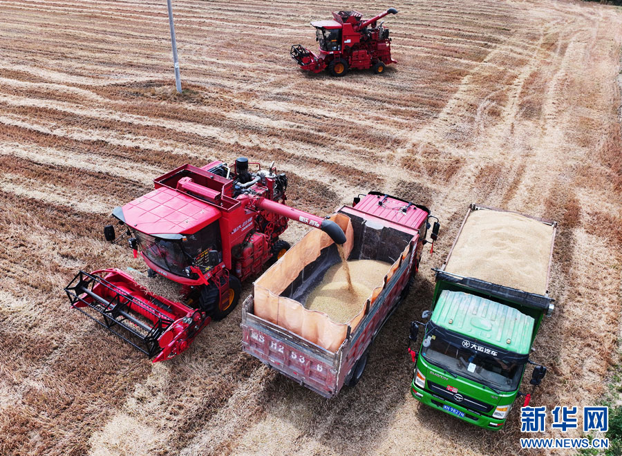 收割機卸下剛收獲的小麥。新華網(wǎng)發(fā)(胡衛(wèi)國 攝)