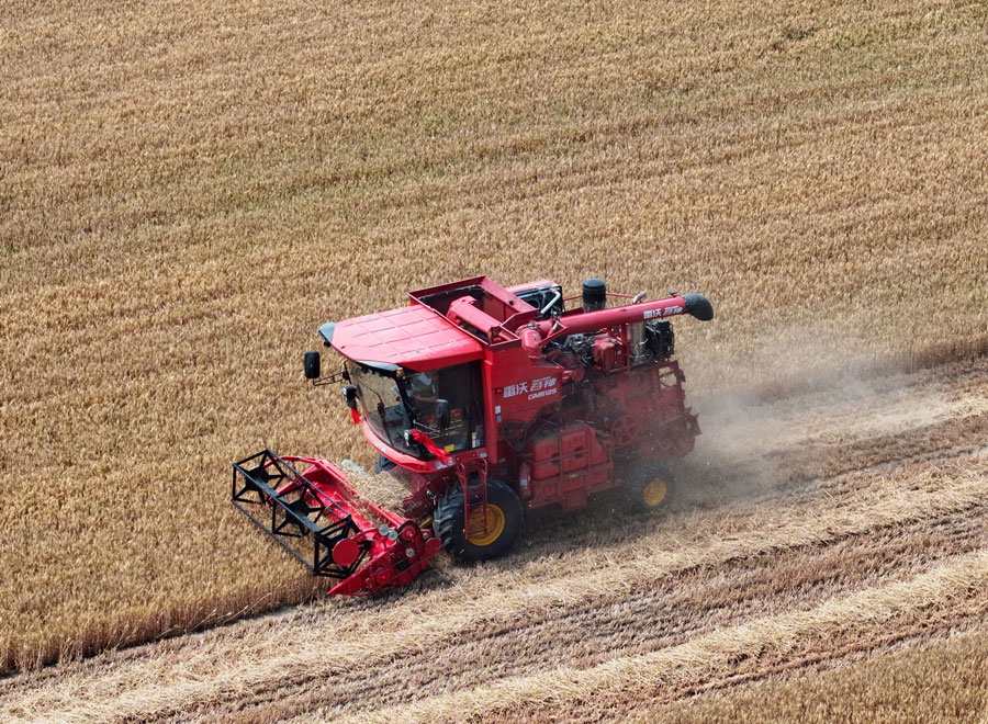 種糧大戶利用大型收割機收獲成熟的小麥。新華網(wǎng)發(fā)(胡衛(wèi)國 攝)