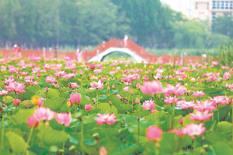 6月21日,淮北市桓譚公園荷塘里荷花嬌艷欲滴,美不勝收,為炎炎夏日增添詩意。通訊員萬善朝 攝