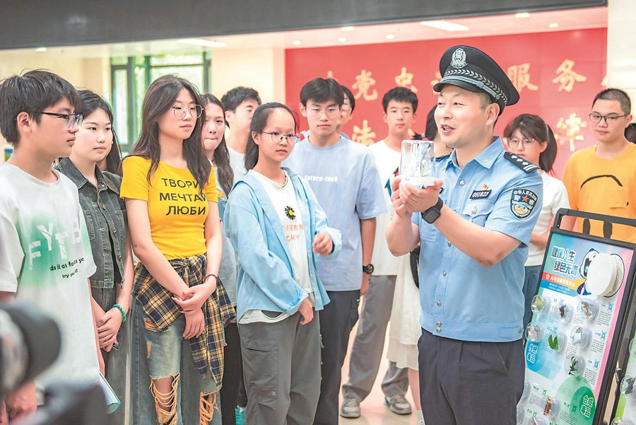 6月24日,來安縣公安局內(nèi),一名警官正在給學生開展禁毒宣傳。通訊員 呂華 攝