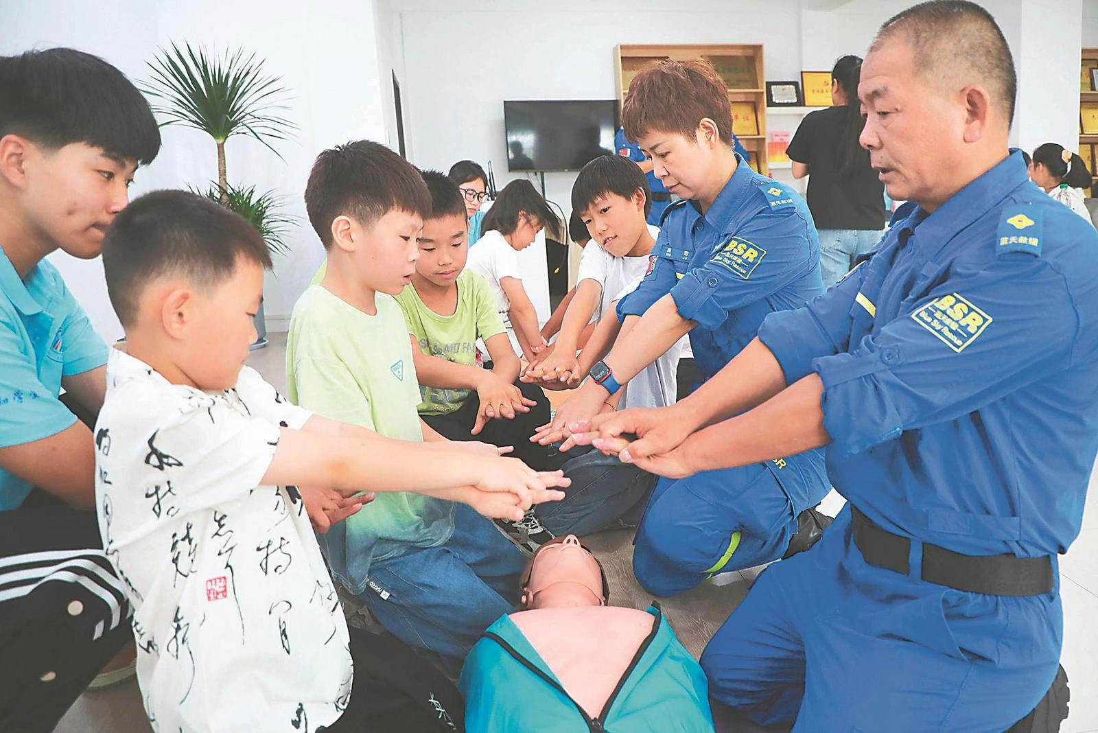 7月7日,六安市金安區望城街道正陽社區,學生們在六安市藍天救援隊隊員的指導下學習心肺復蘇等急救知識,提高安全防范意識和自救能力。通訊員 田凱平 攝
