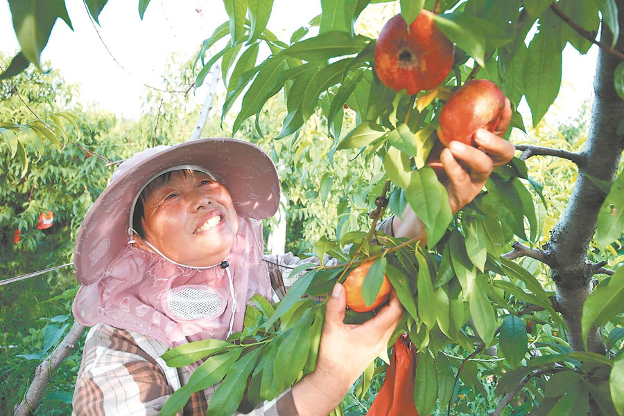 7月4日,淮北市杜集區石臺鎮劉莊村,果農搶抓晴好天氣采摘蟠桃。近年來,當地持續推動蟠桃、黃桃等特色產品種植,帶動農民增收。通訊員 劉棋 王倩雯 攝