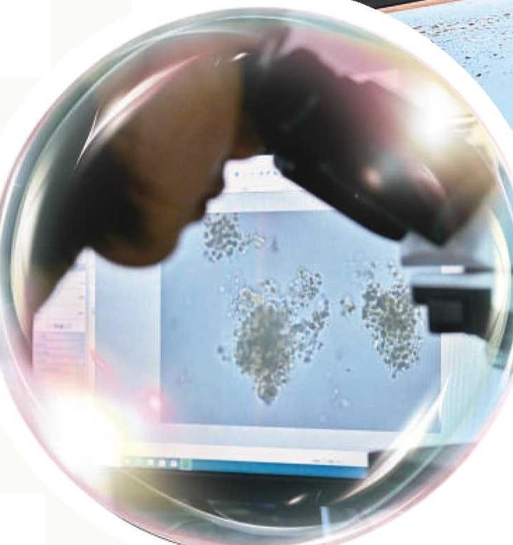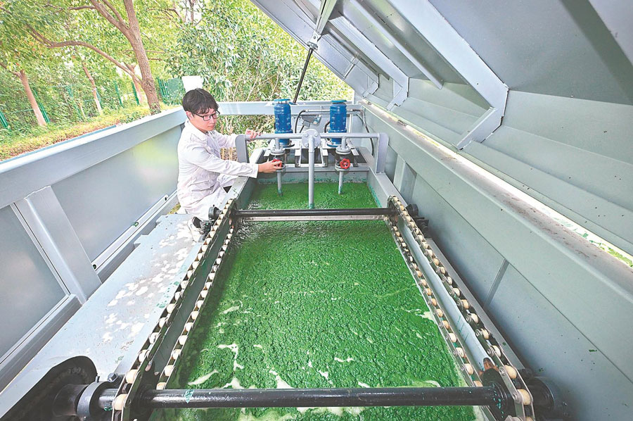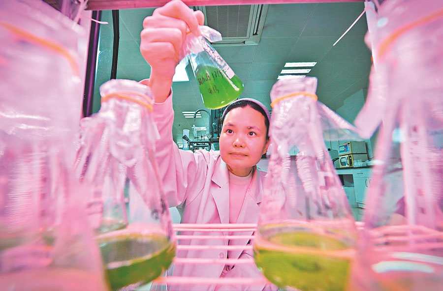 7月28日,合肥工業大學食品與生物工程學院生物質資源化轉化團隊負責人馬曉靜在培養箱里觀察不同藻類品種的生長情況。