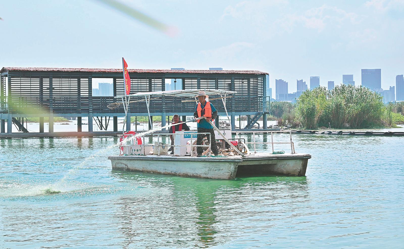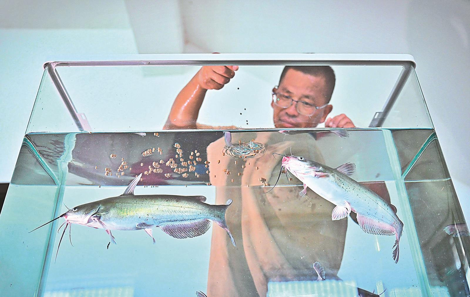 7月29日,國家級安徽巢湖斑點叉尾鮰良種場內,工作人員使用藻類飼料開展水產養殖試驗。