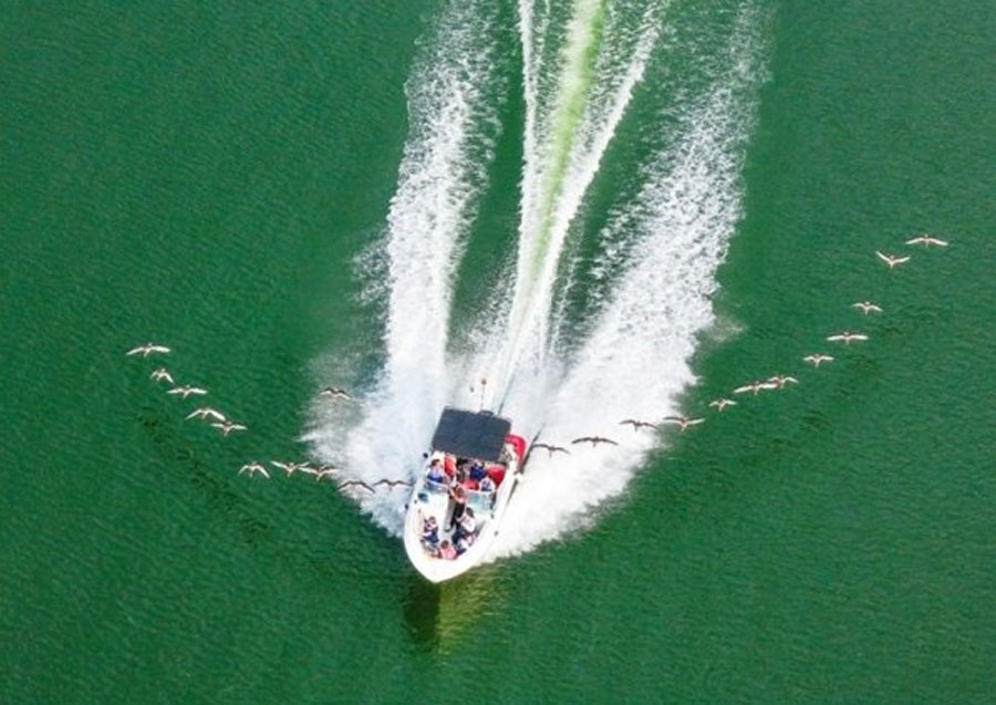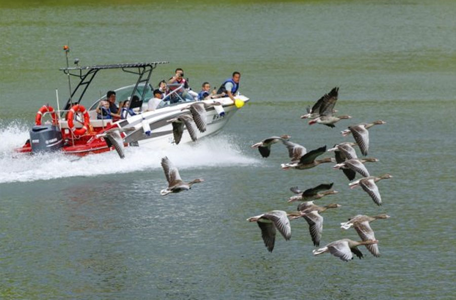 當(dāng)日,游客搭乘快艇破浪而行,數(shù)十只經(jīng)專業(yè)訓(xùn)練的鴻雁展翅凌空、優(yōu)雅伴飛,與青山碧水相映成趣,共同勾勒出一幅人與自然和諧共生的生態(tài)畫卷。施亞磊 顧雪菲/攝