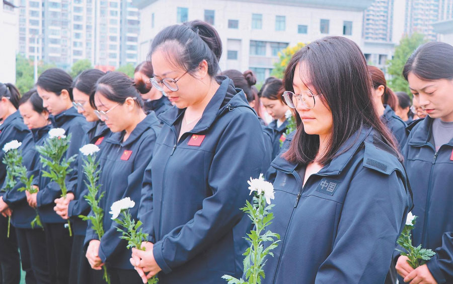 9月18日,伴隨著防空警報的拉響,阜陽市實驗小學(xué)北京路校區(qū)全體師生手捧潔白的菊花,整齊列隊,寄托哀思。特約攝影 王彪 通訊員 萬媛媛 攝