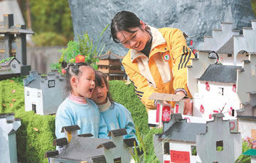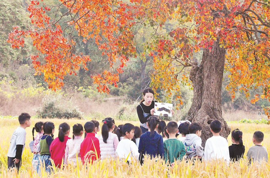 11月11日,黟縣宏村景區(qū)附近的稻田里,一群萌娃跟隨老師識(shí)別稻谷、撿拾紅葉、繪制自然美景,體驗(yàn)大自然之妙趣。通訊員 朱光明 攝