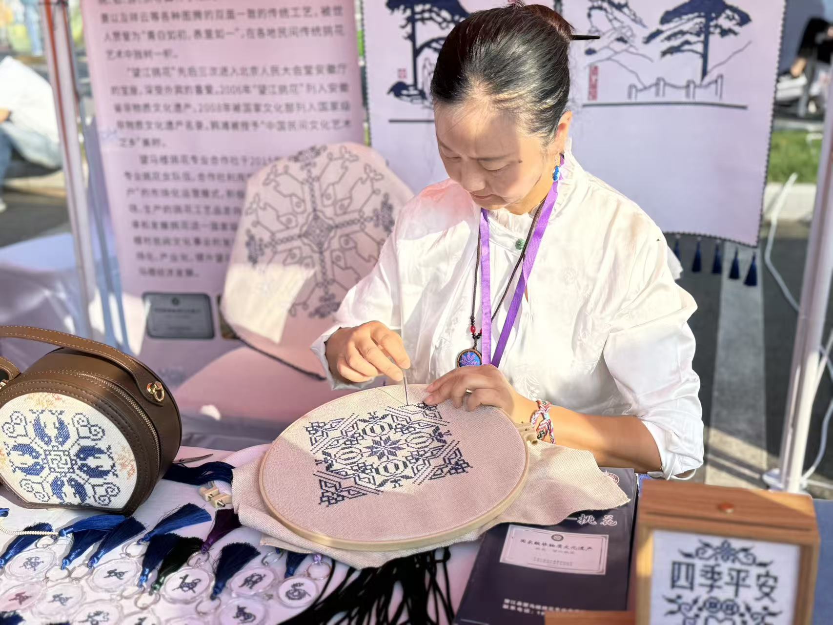 在展區(qū)的靜謐一角,“望江挑花”的展示吸引了不少人駐足。一位挑花女工正凝神屏息,手中的銀針在棉布上下翻飛。她運(yùn)用“挑、鉆、游、織”四種手法,以藍(lán)線在白布上游走,花紋輪廓便逐漸清晰。最令人稱奇的是,繡品正反兩面如鏡像般一致。一位年輕觀眾低聲念出展板上的介紹:“青白如初,表里如一——說(shuō)得真貼切。”這一刻,古老的技藝與當(dāng)代的欣賞目光相遇。