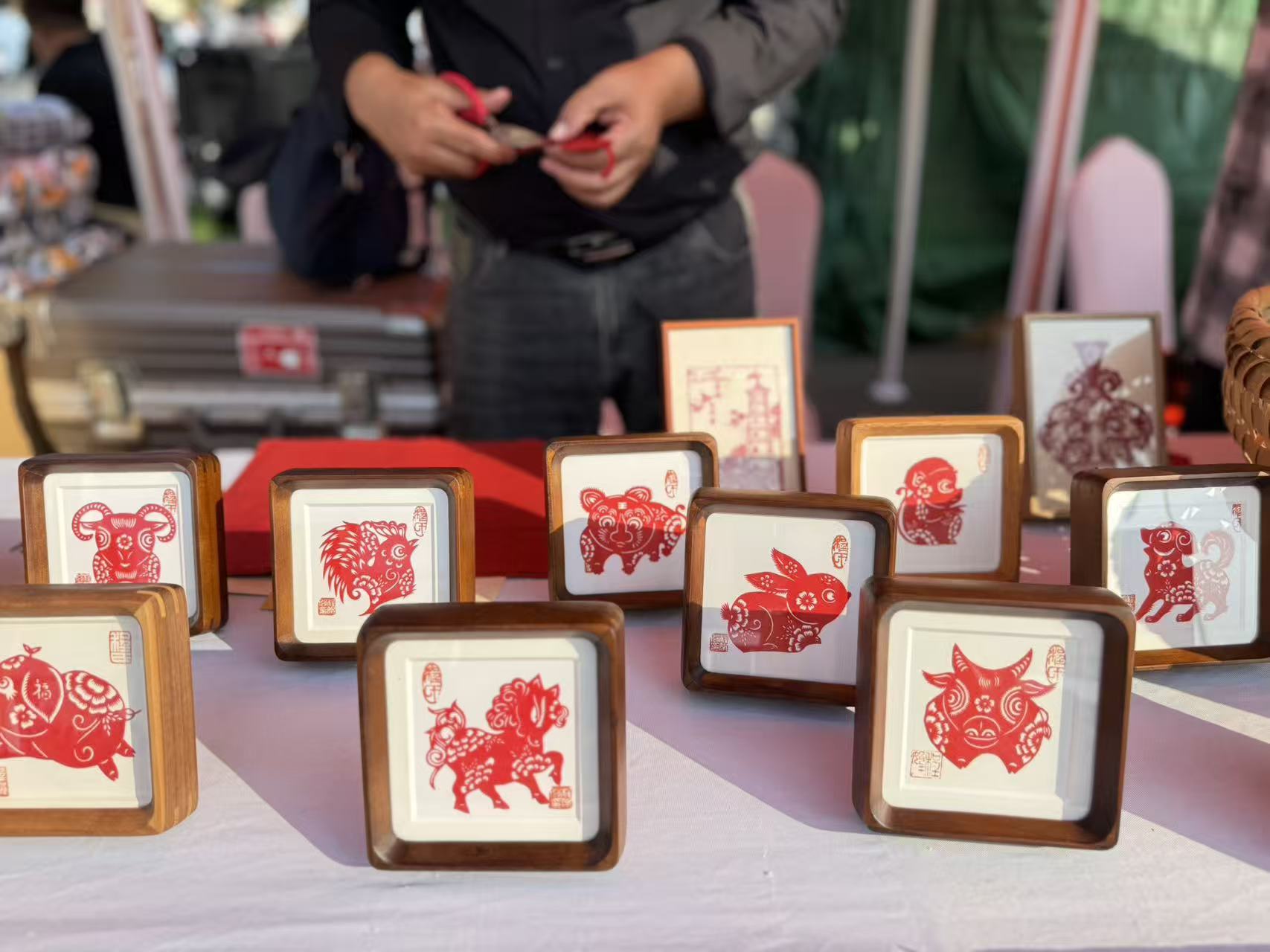 來(lái)自阜陽(yáng)的程氏剪紙第二代傳承人程興紅手握剪刀運(yùn)用自如,經(jīng)他手剪出的動(dòng)物、古今人物、花鳥魚蟲千變?nèi)f化,造型簡(jiǎn)潔而有韻味。