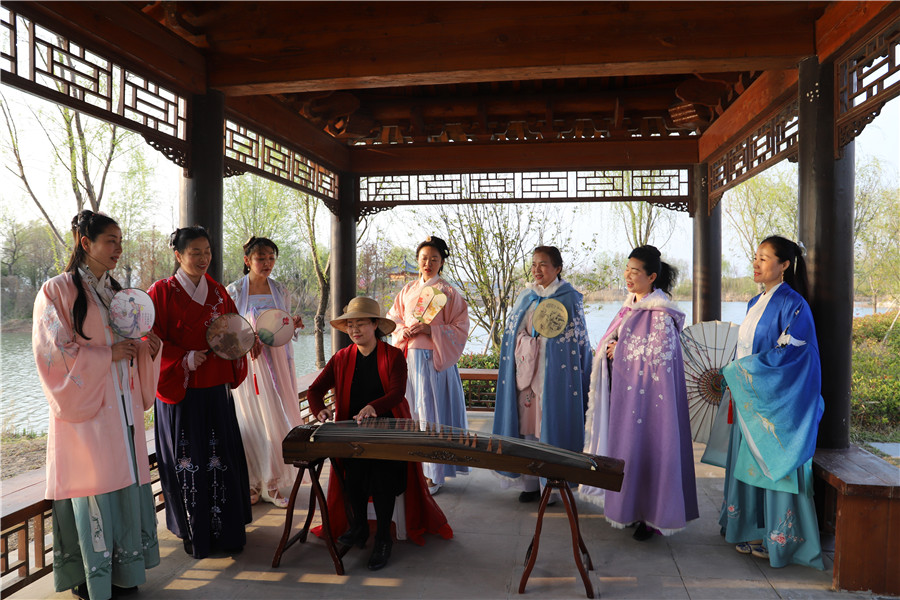 在一處涼亭中,一群身著漢服的女士正在彈唱《枉凝眉》。古箏聲典雅悠揚,彈奏者和伴唱者皆充滿古意,她們都是東籬漢服社的成員。“我們是自發成立的民間組織,主要是因為熱愛,想傳播淮北的古箏、古琴、太極、朗誦、舞蹈、古詩詞、茶道等傳統文化,現在已經有240多人。”社長華虹介紹道。此時,另一邊的一群成員正在打太極。