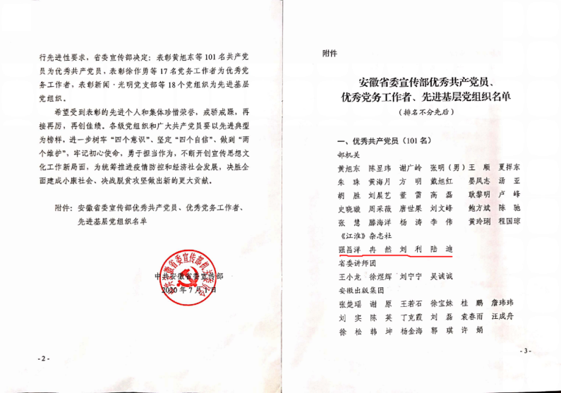 江淮雜志社強昌洋、冉然、劉利、陸迪四人表彰為優秀共產黨員,政治理論部黨支部表彰為先進基層黨組織。