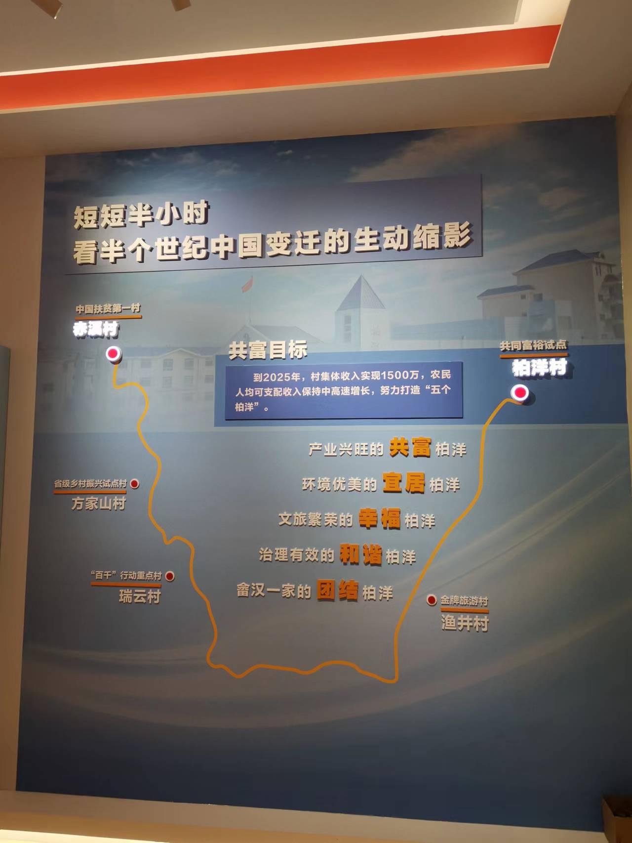青山如黛,綠水如煙,水榭亭臺(tái)倒映湖面,噴泉夏荷相映成輝,細(xì)雨中的柏洋村,如詩(shī)如畫。在“柏洋促進(jìn)共同富裕主題展”展館內(nèi),展示了這個(gè)“全國(guó)小康建設(shè)明星村”共同富裕的故事。