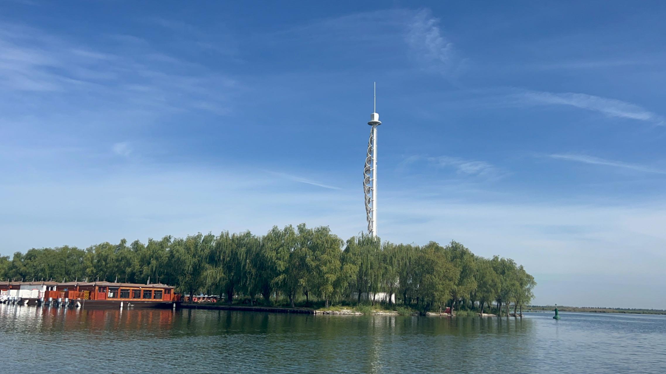 船行至白洋淀中,兩側蘆葦蕩漾、荷葉連連,撐船而過的漁民帶著滿船的鸕鶿往蘆葦蕩深處駛去,好一幅風景秀美、人與自然和諧共生的美好畫卷。